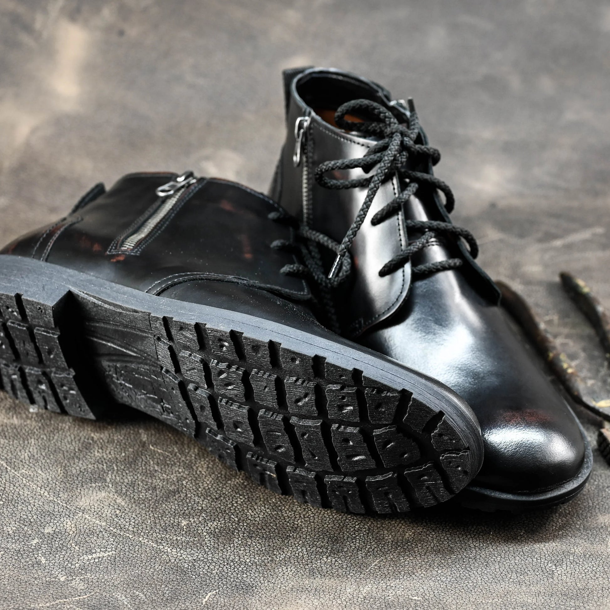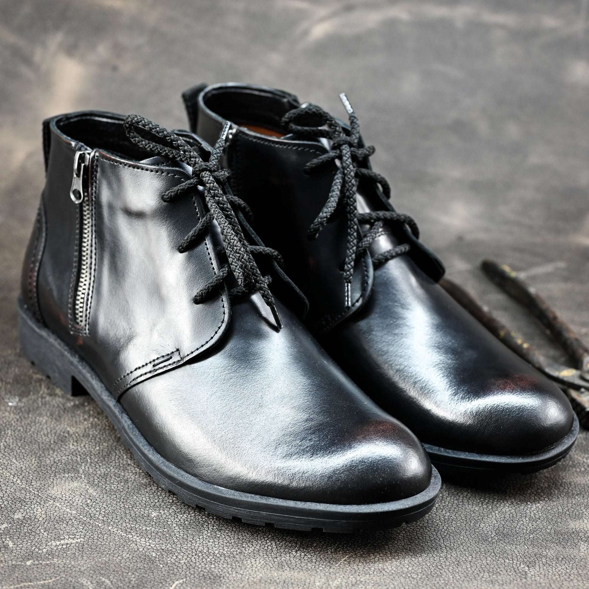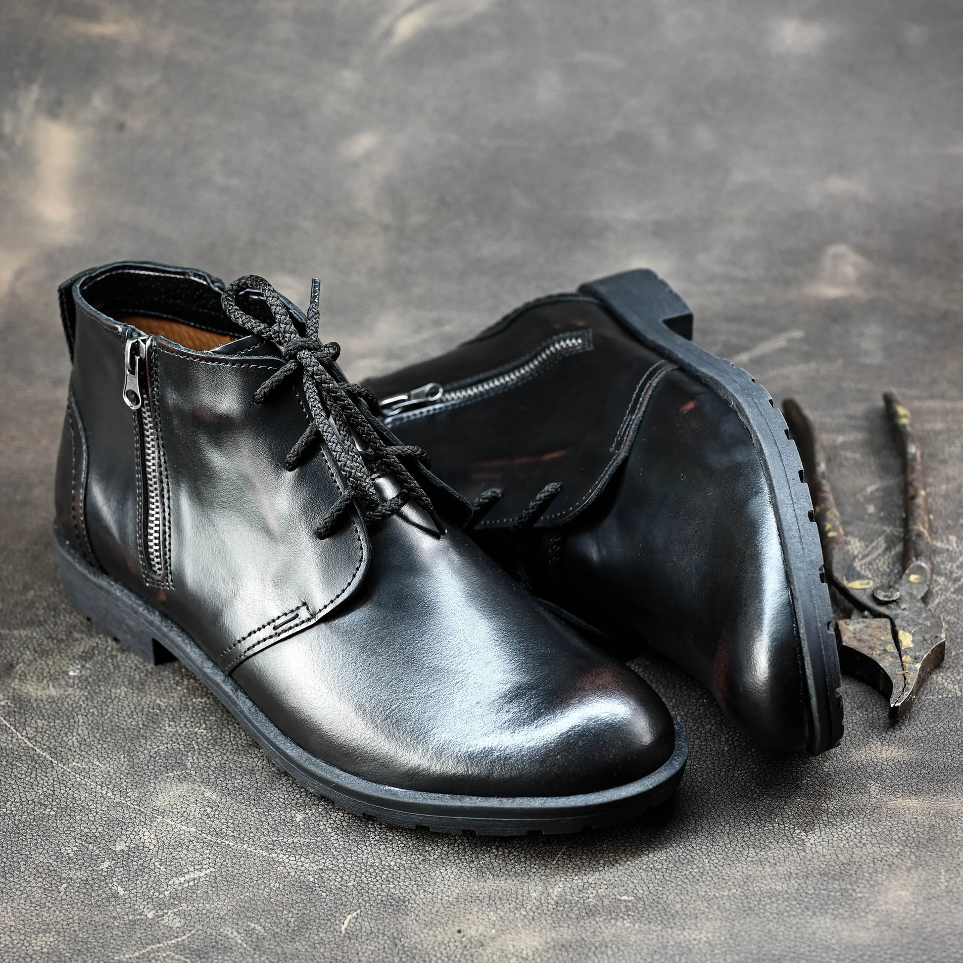 Raven are handcrafted men’s black leather ankle boots designed for everyday comfort, durability and a clean modern style. Made from premium full-grain leather, the boots combine classic lacing with practical double side-zippers, allowing quick and easy on/off without compromising the fit.