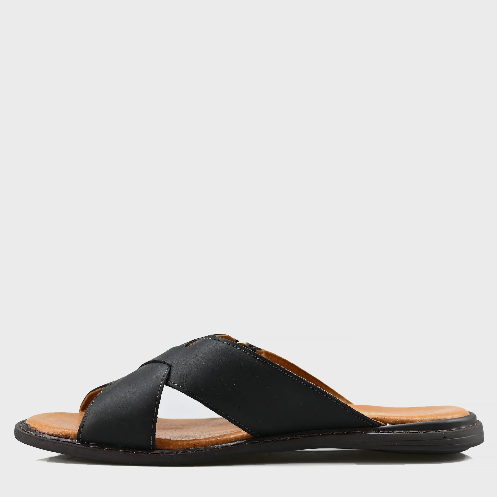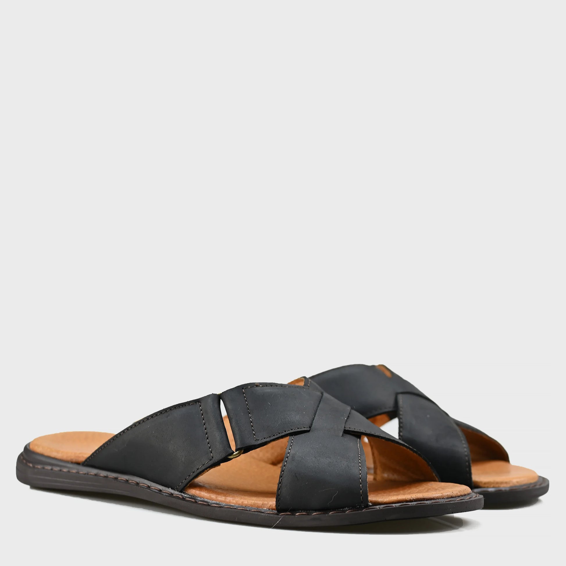 Black Leather Men’s Cross-Strap Slides – Nero | KarolShoes