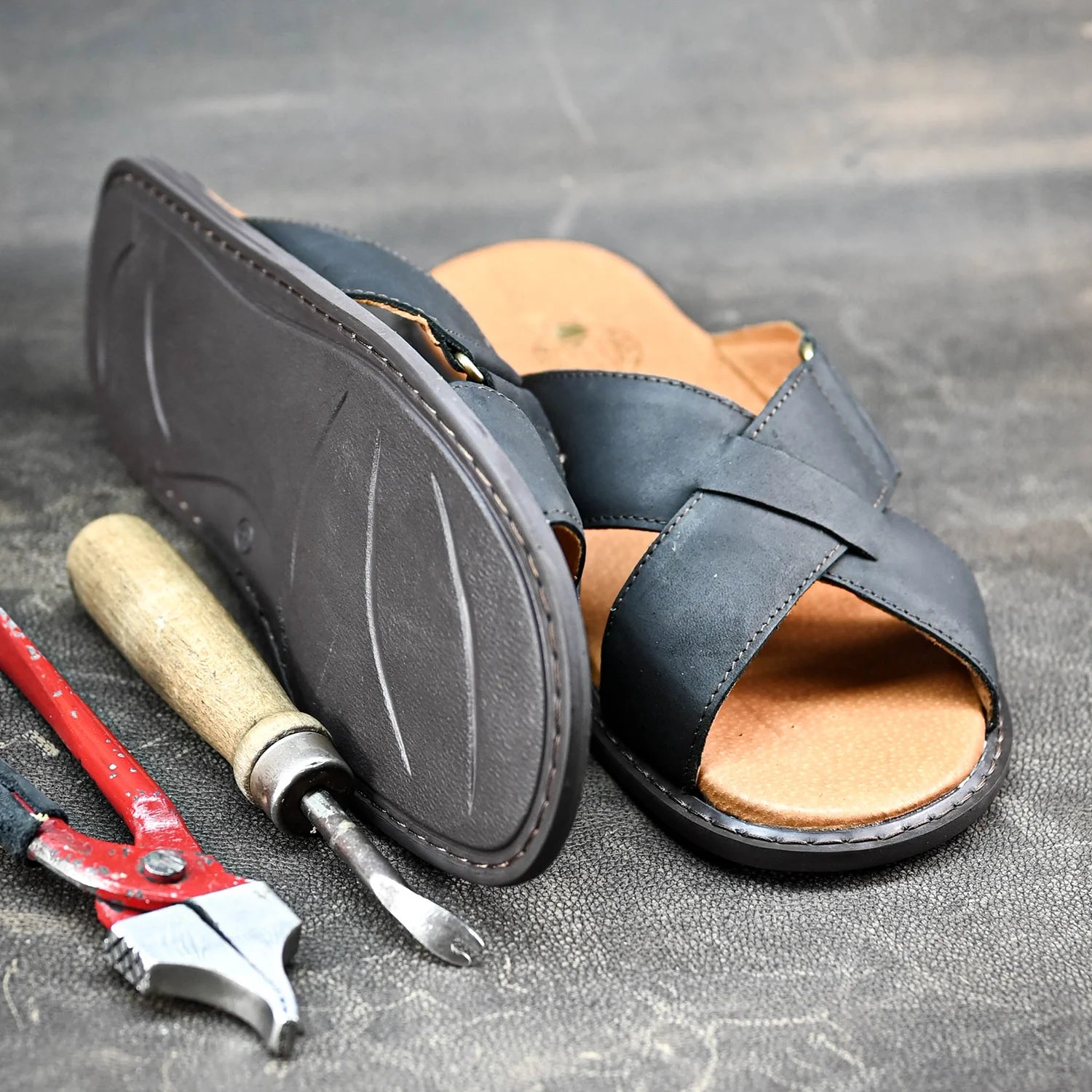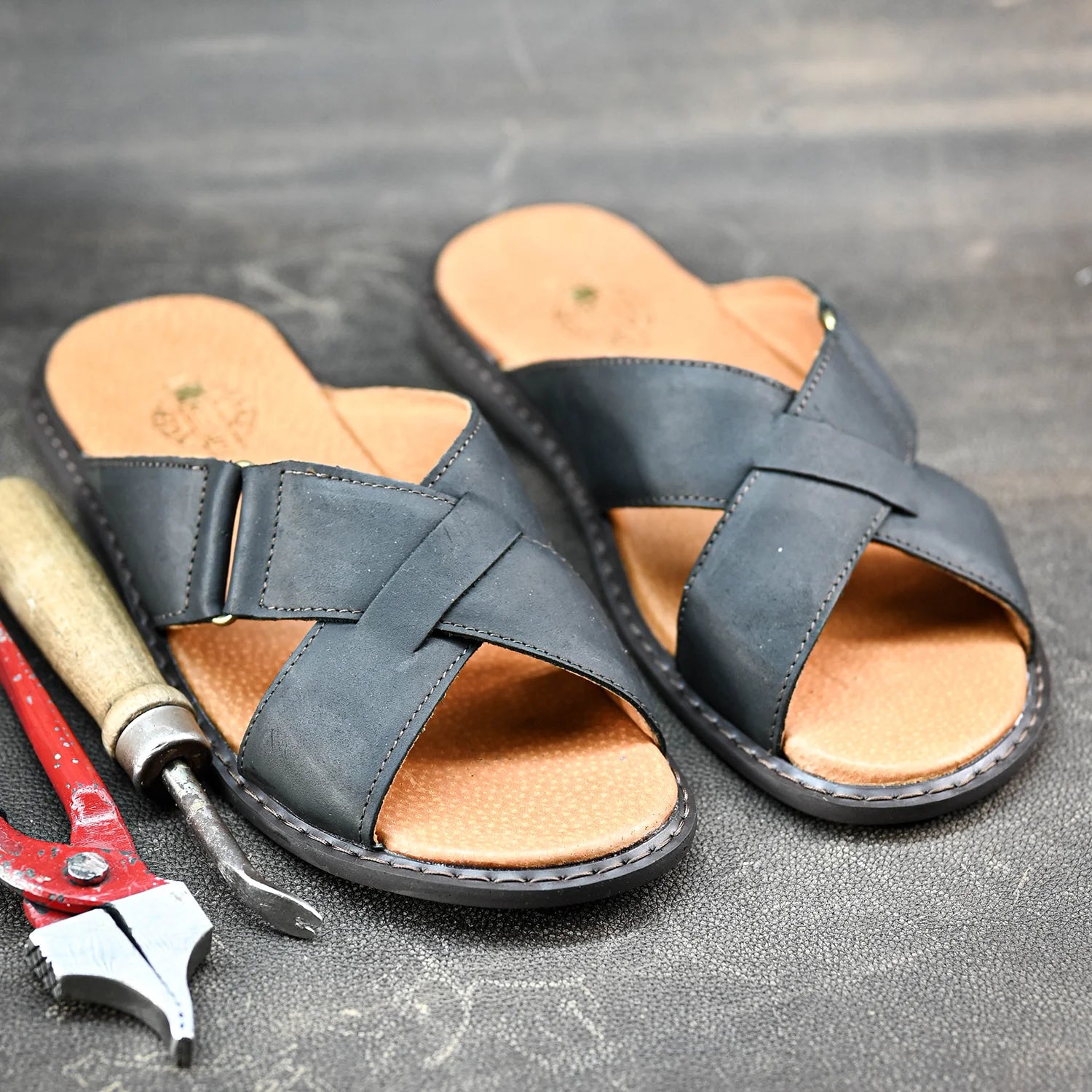 Handmade Black Leather Men’s Cross-Strap Slides – Nero