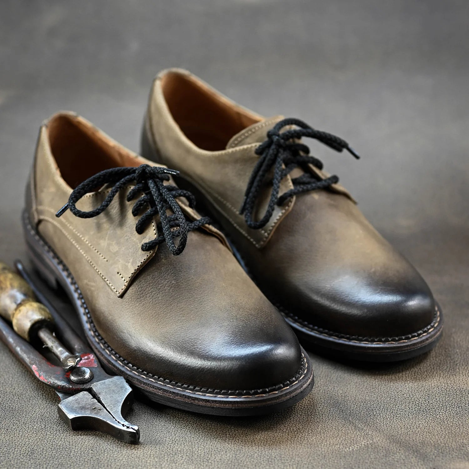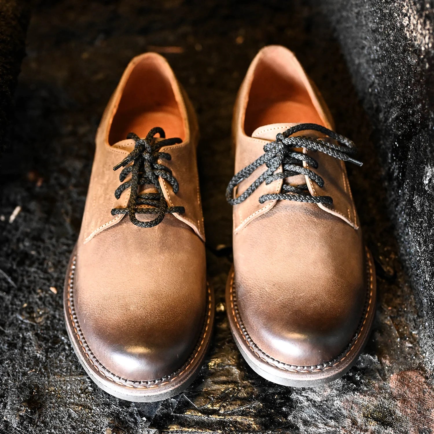 The Aldo are handmade men’s derby shoes for those who value durability, comfort and understated style. Crafted in Poland from thick, semi-matte full-grain brown cowhide, they pair a clean, classic silhouette with a rugged artisanal finish that develops a rich patina over time.