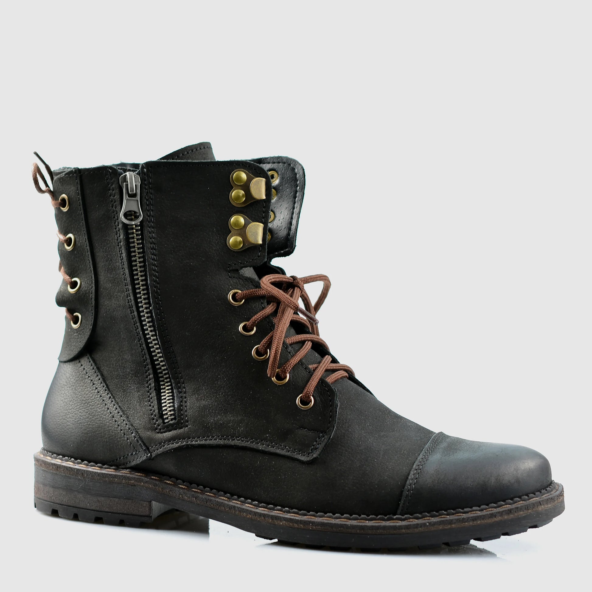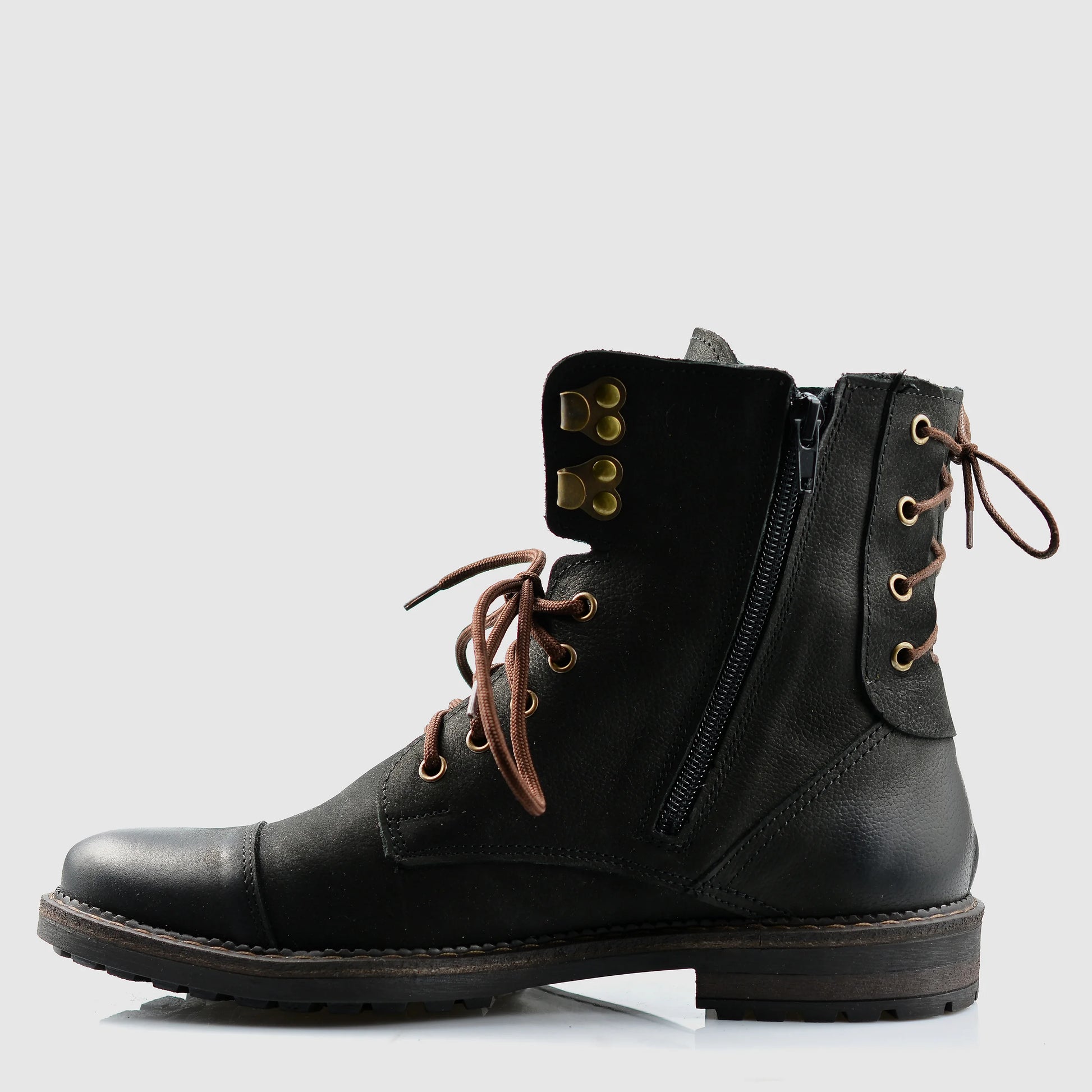 Handmade in Poland from a unique combination of natural full-grain leather and nubuck, each pair carries an authentic artisanal finish. Dual side zippers and strong lacing ensure quick, comfortable wear, while the leather lining and insole provide breathability and all-day comfort.