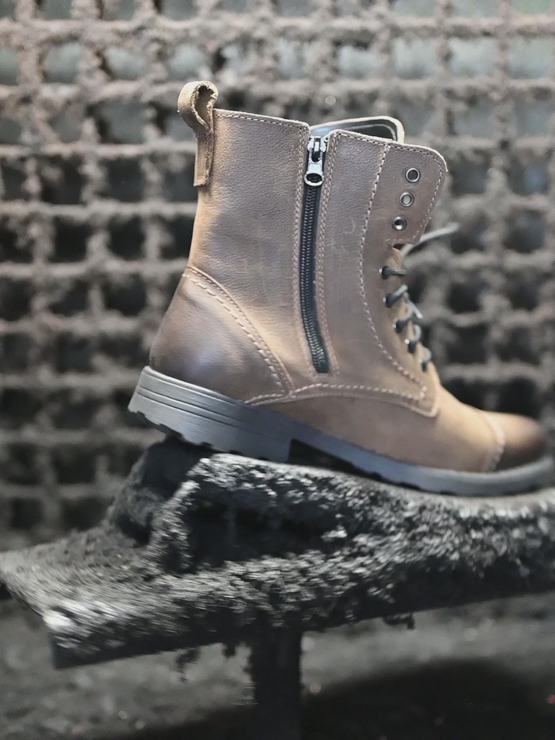 The Elegant are handmade men’s military-style leather boots with a bold, assertive profile. Crafted in Poland from premium full-grain brown leather, they combine a chunky lugged sole, side zippers for quick on/off, and precise toe-cap stitching — a masculine style with a touch of refinement for city wear and beyond.